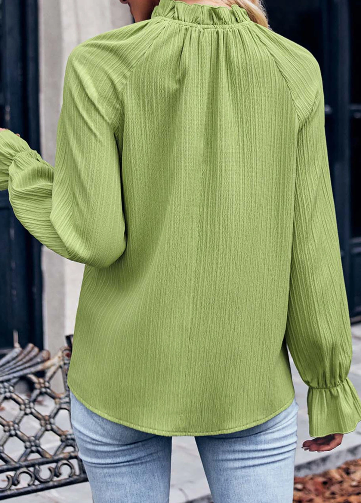 Avocado Green Ruched Long Sleeve Stand Collar Blouse