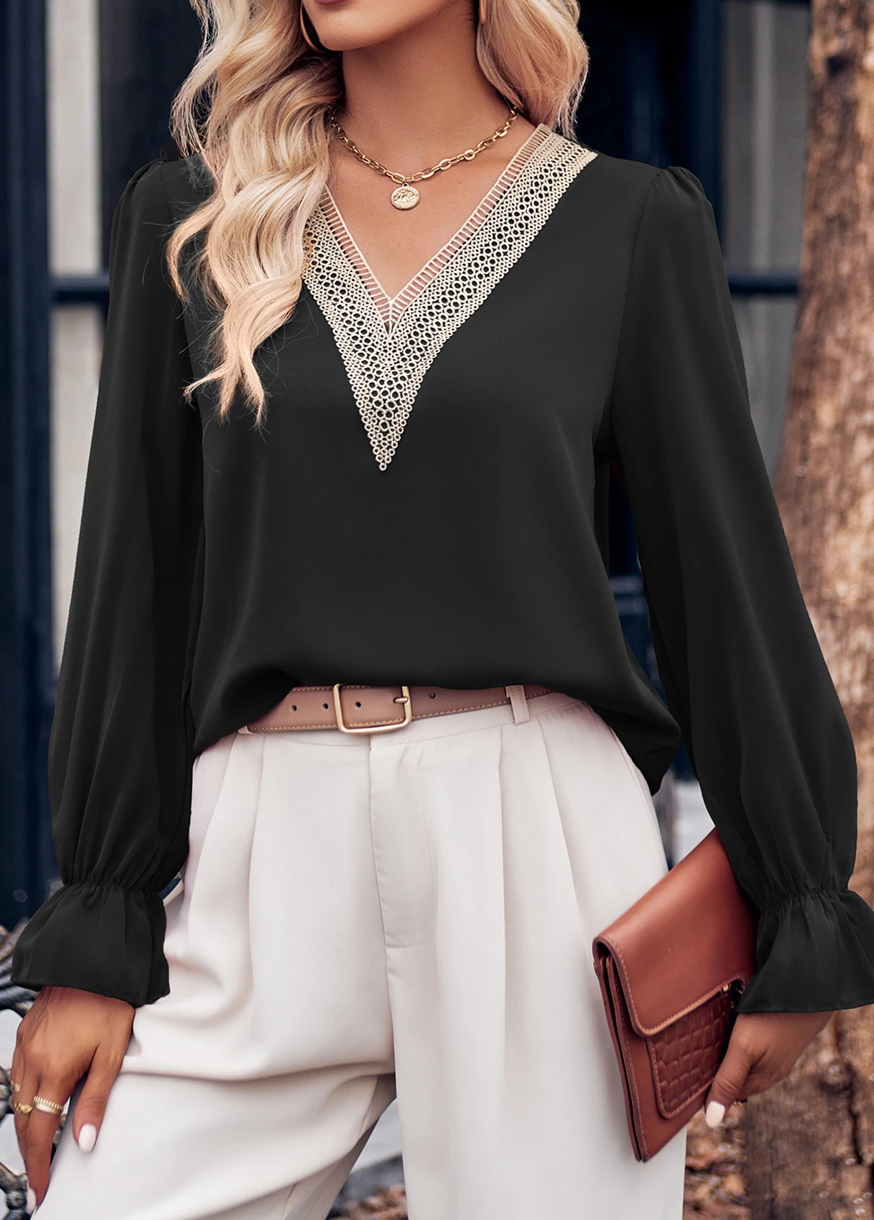 Black Patchwork Long Sleeve V Neck Blouse