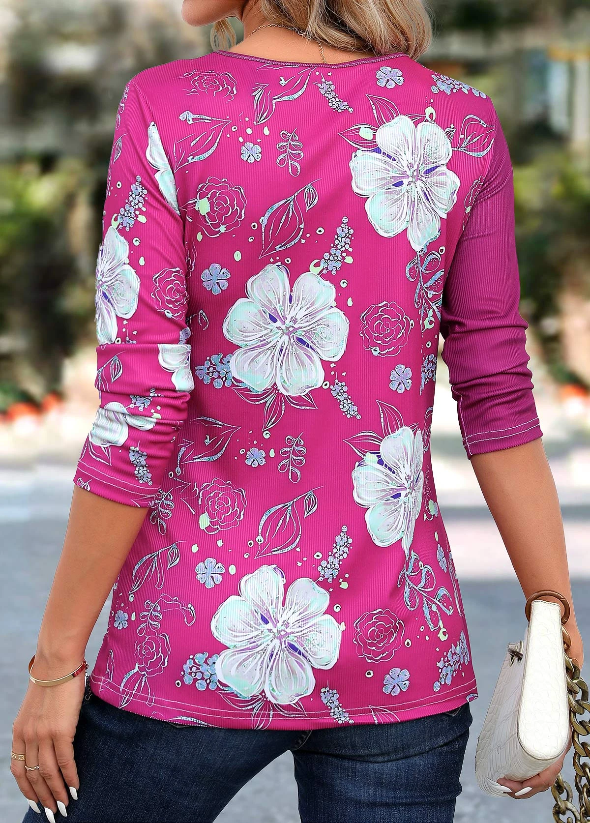 Dark Reddish Purple Asymmetry Floral Print T Shirt