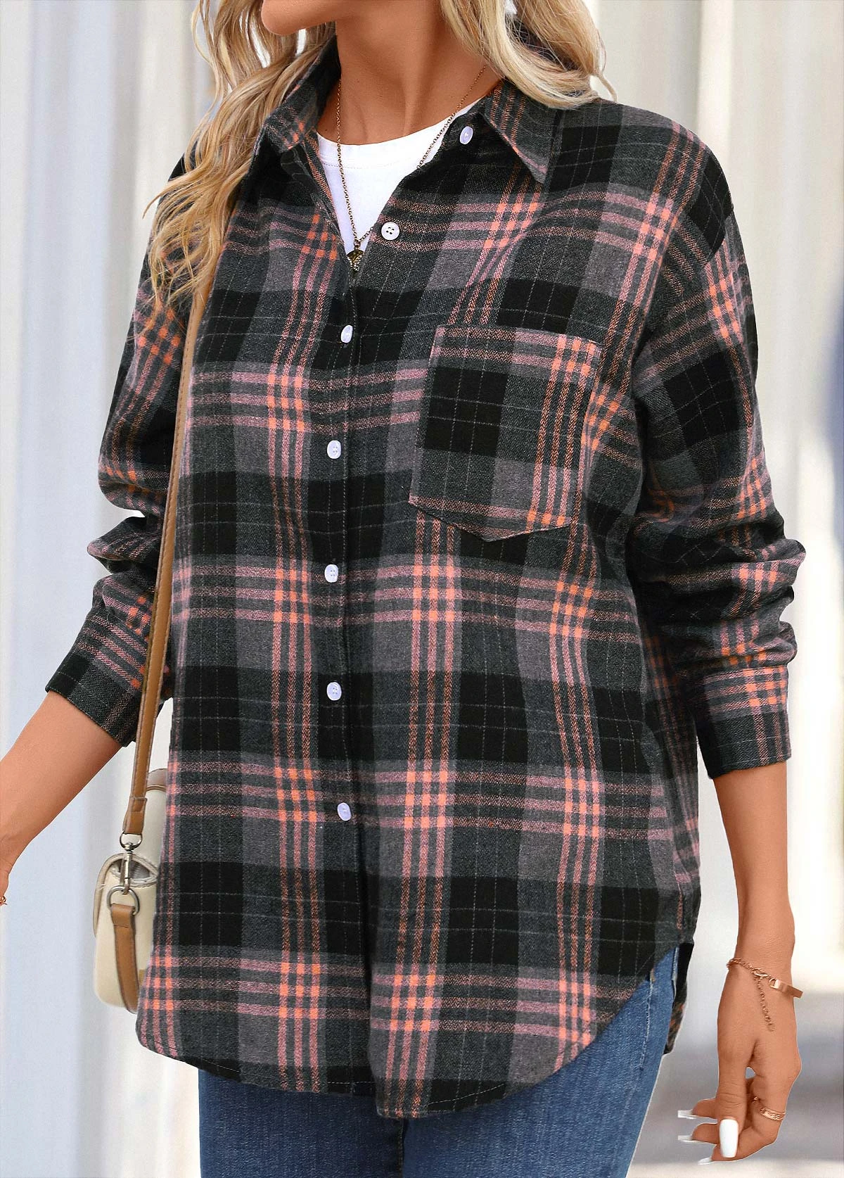 Dusty Pink Button Plaid Long Sleeve Shirt Collar Blouse