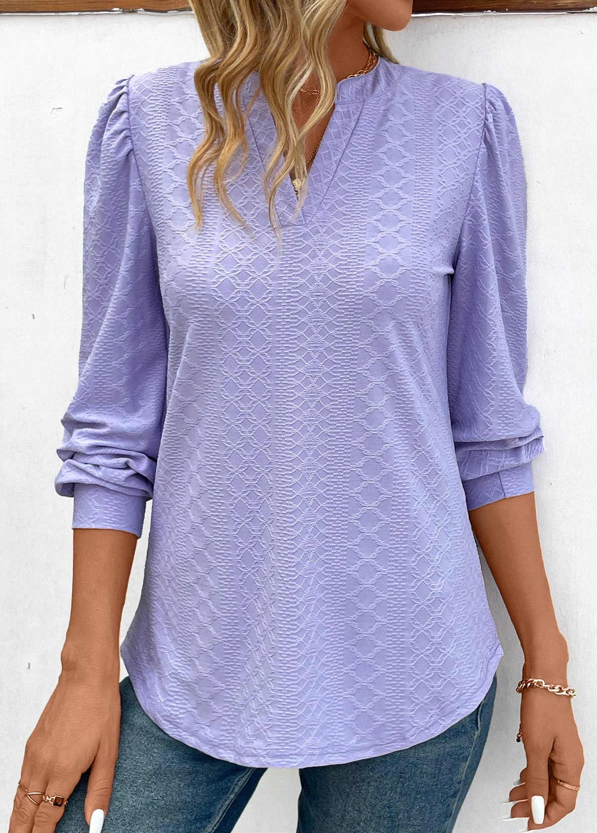 Light Purple Jacquard Long Sleeve V Neck Blouse