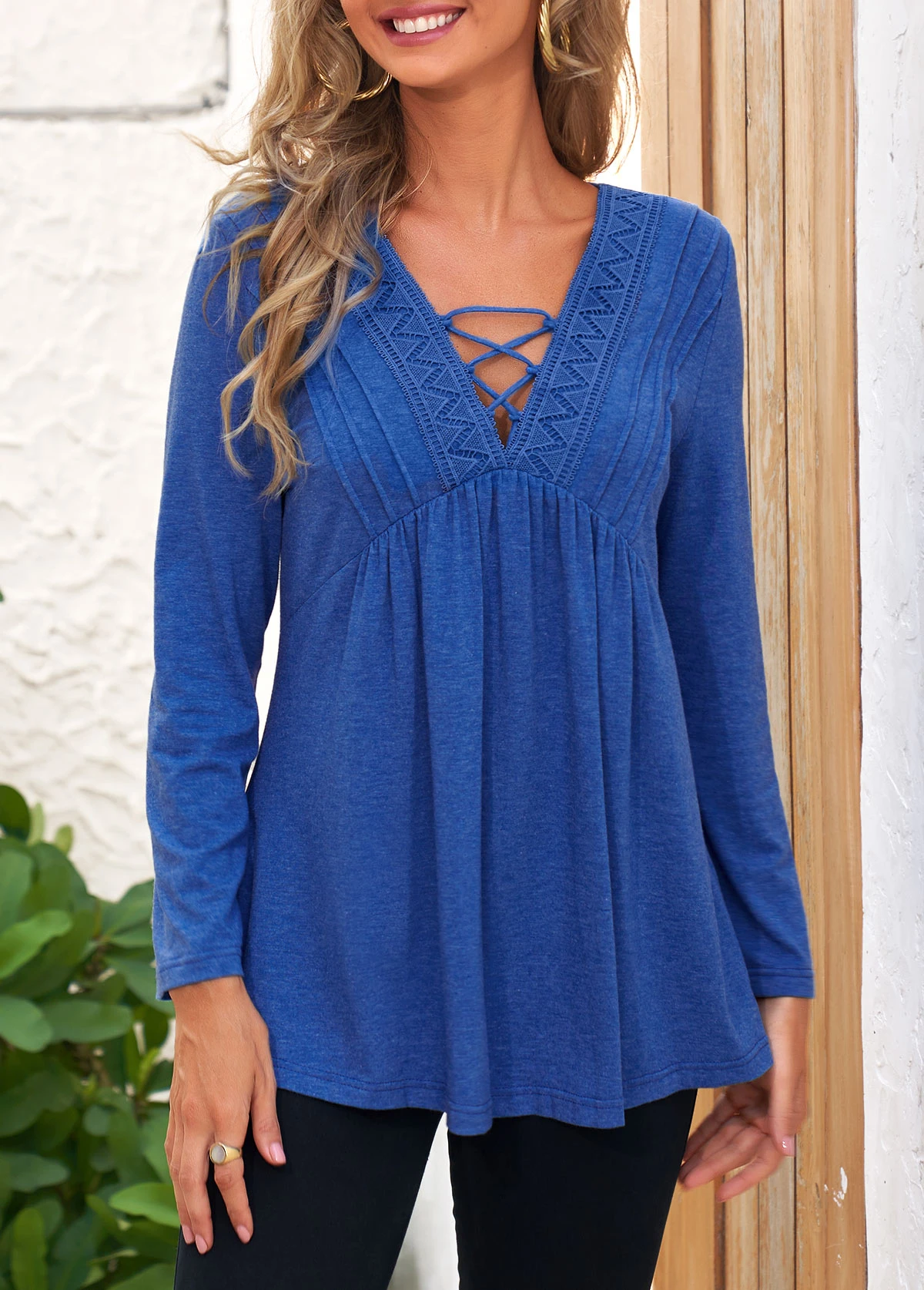 Royal Blue Lace Stitching Long Sleeve T Shirt
