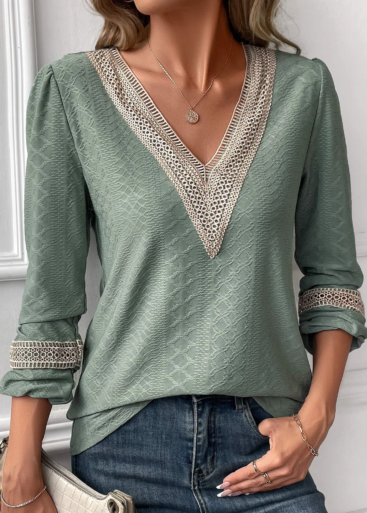 Sage Green Jacquard Long Sleeve V Neck Blouse