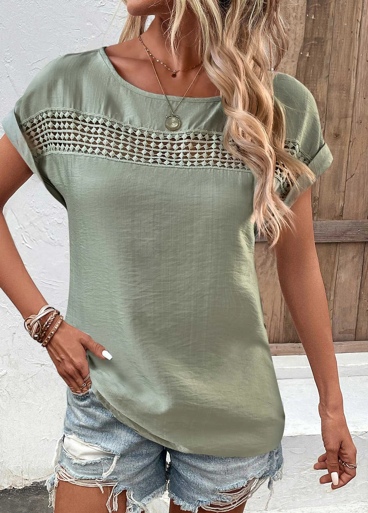 Be the first to review “Sage Green Patchwork Short Sleeve Boat Neck Blouse” Cancel reply