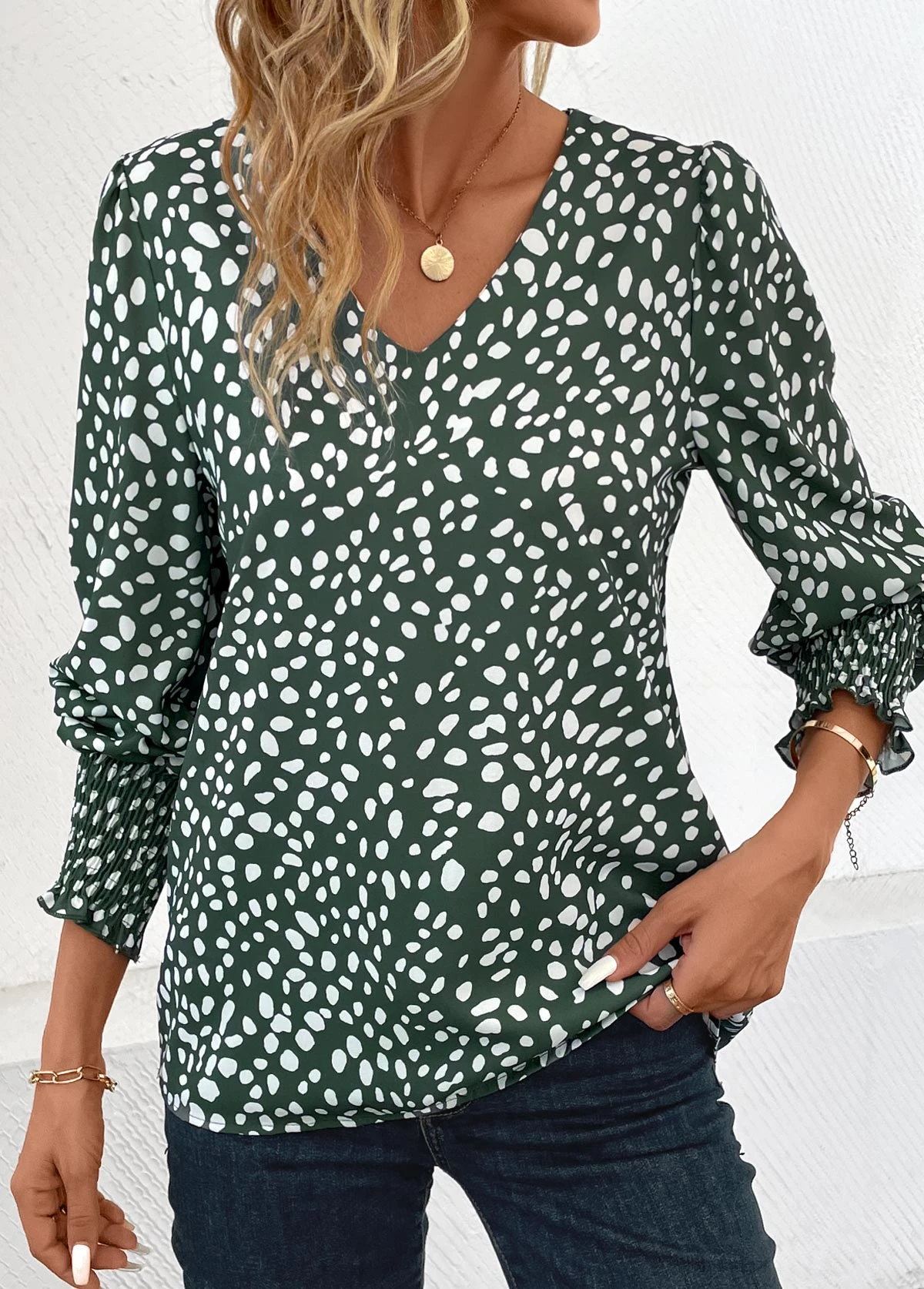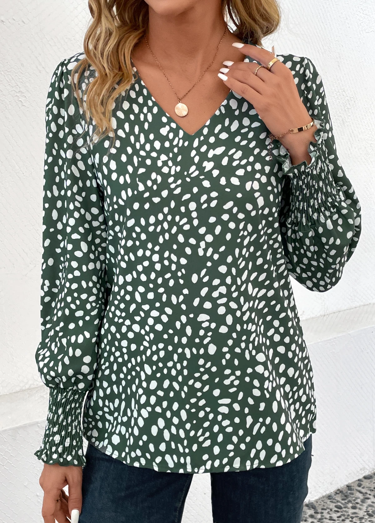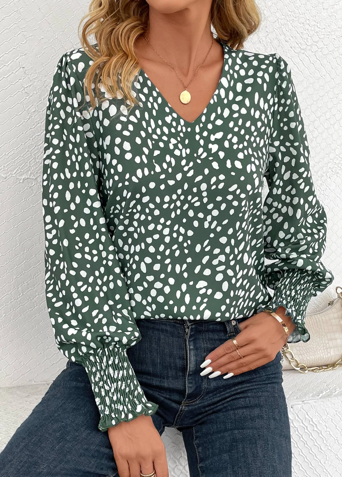 Turquoise Smocked Polka Dot Long Sleeve V Neck Blouse