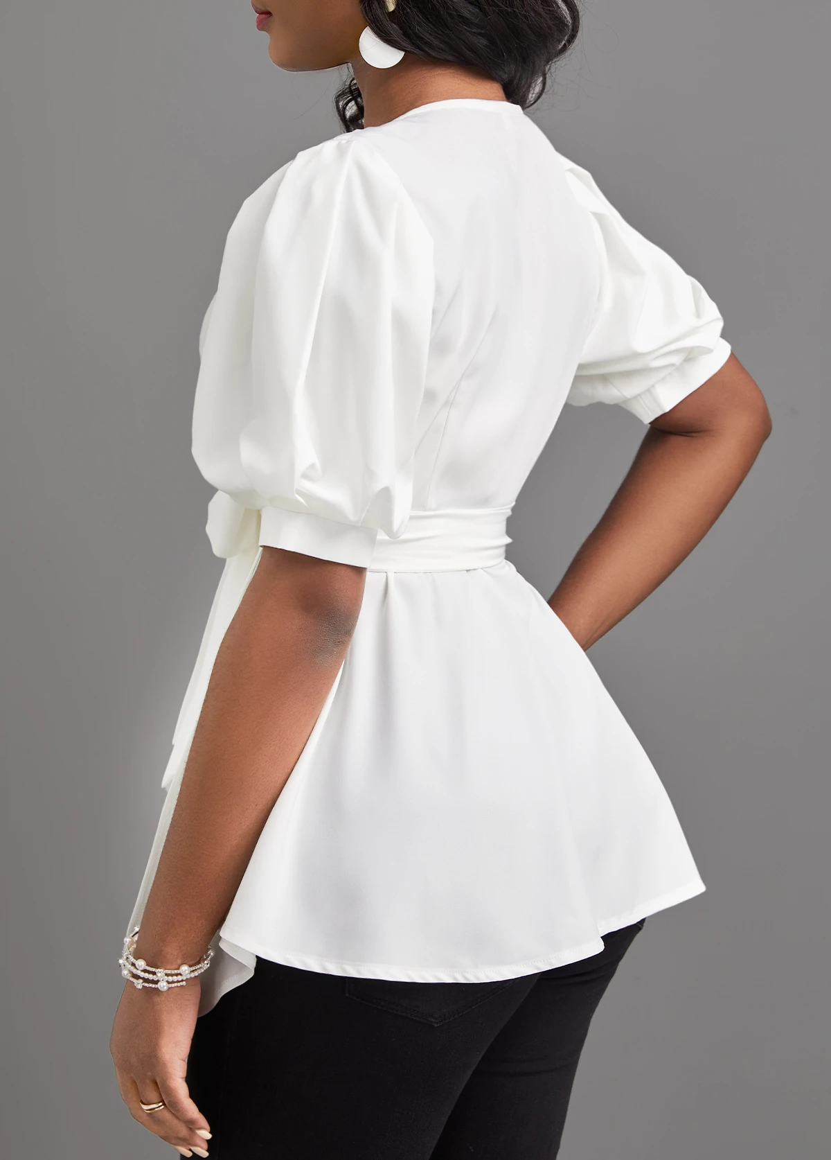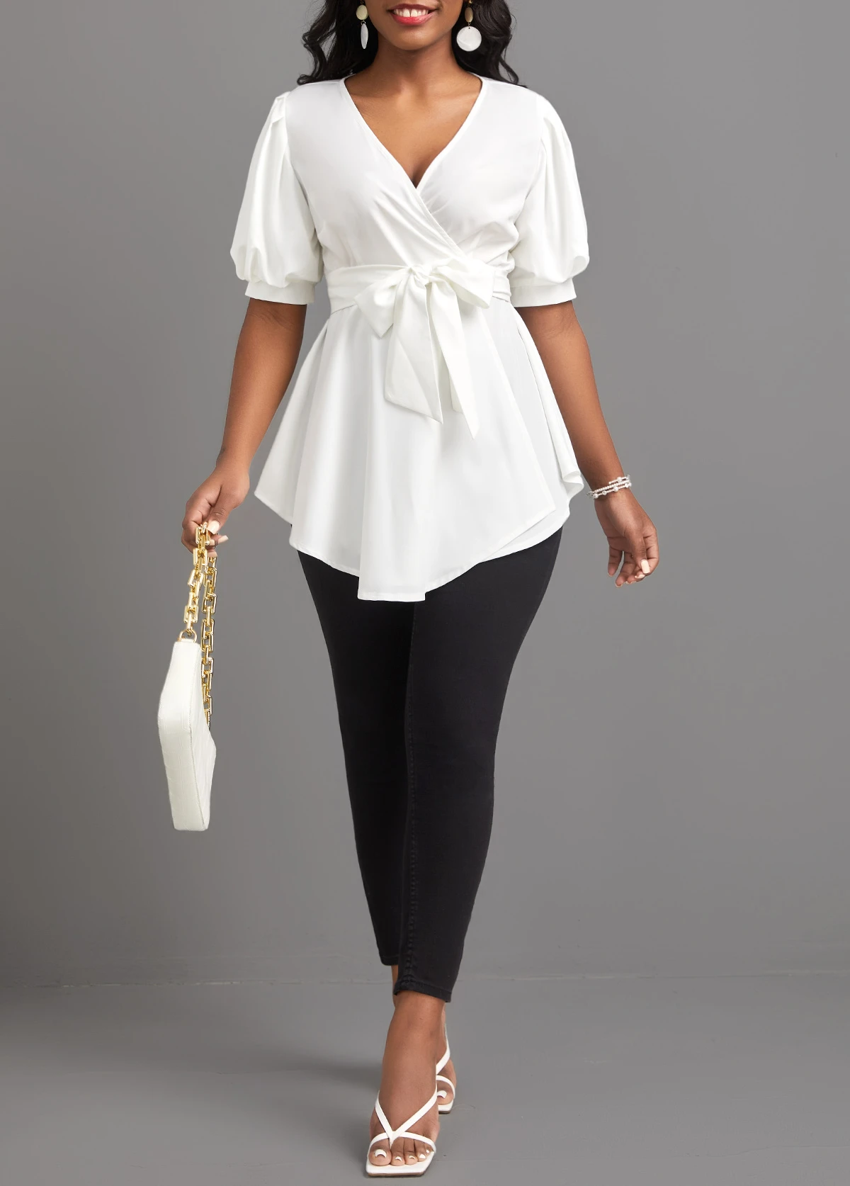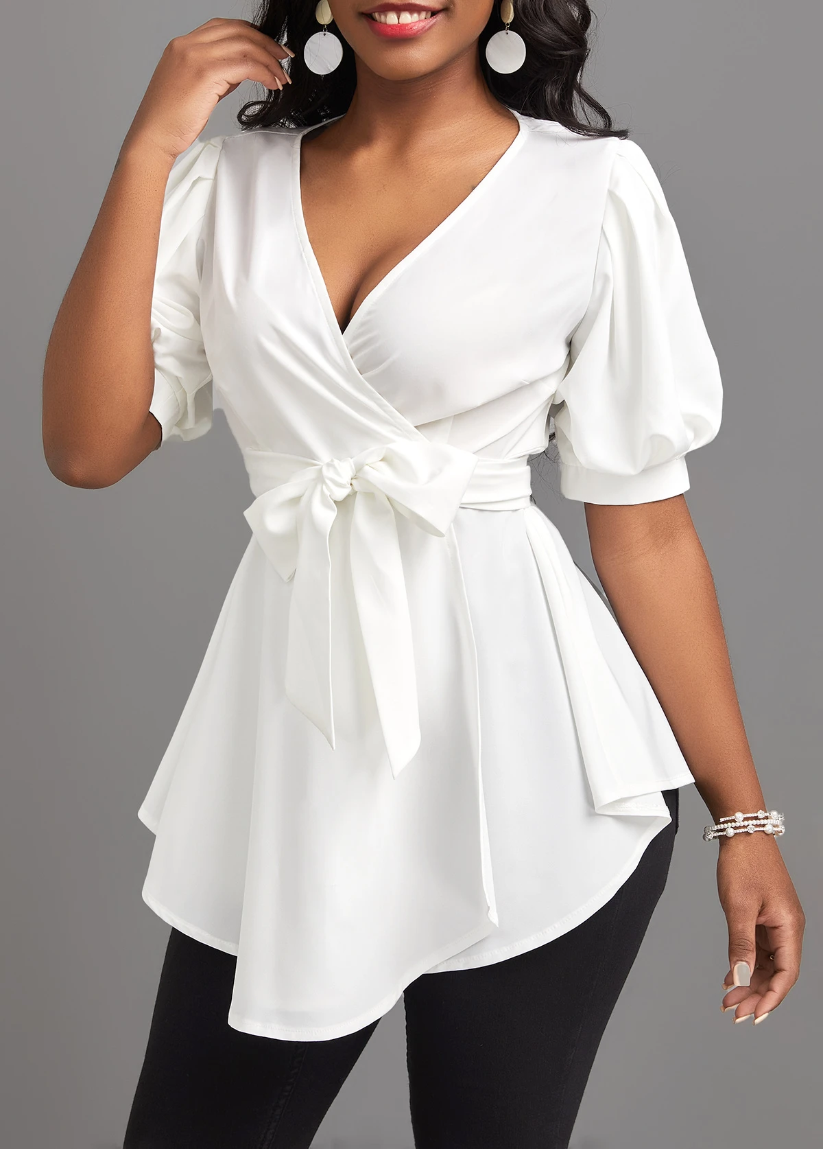 White Asymmetry Short Sleeve V Neck Belted Blouse