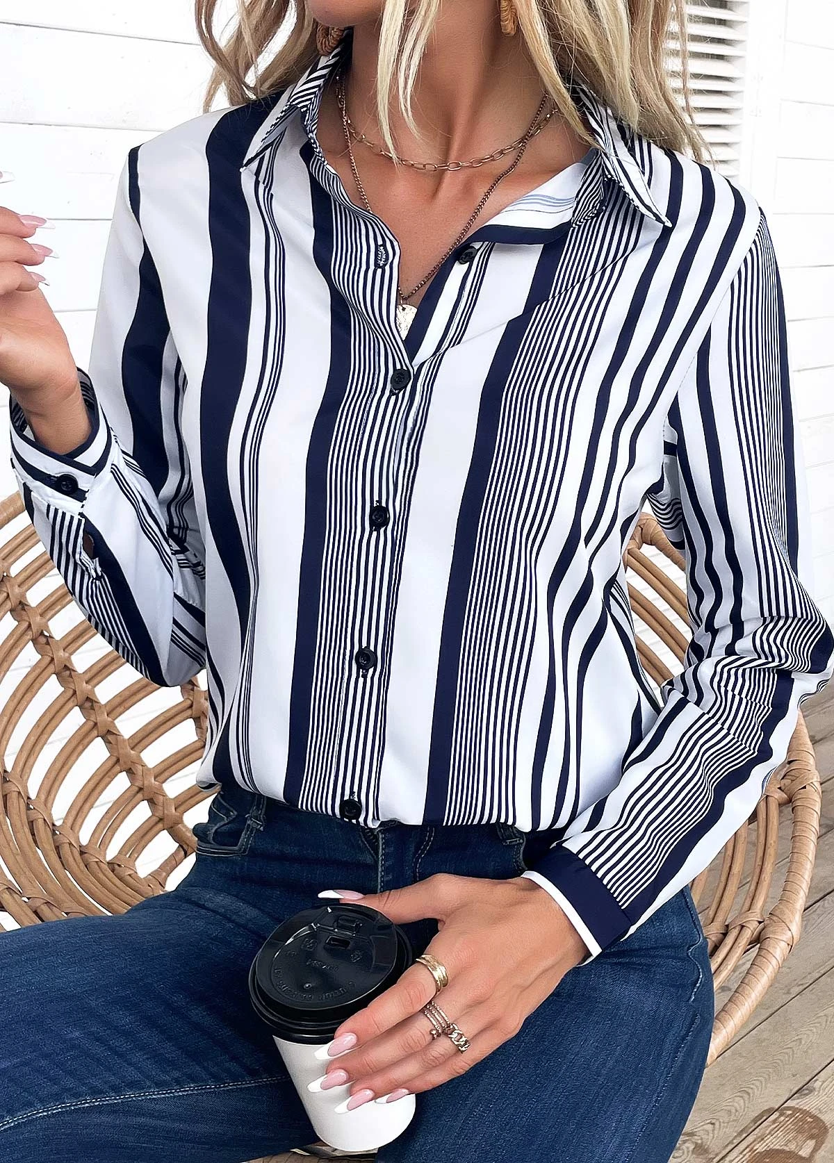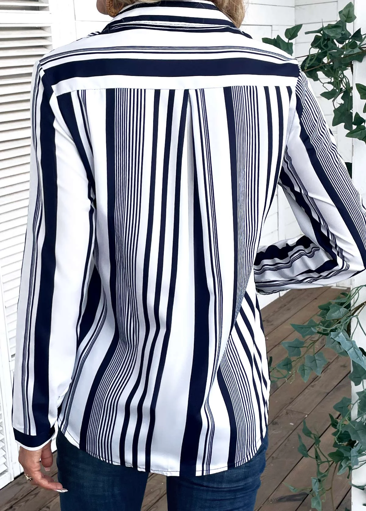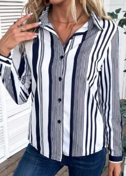 White Striped Long Sleeve Shirt Collar Blouse