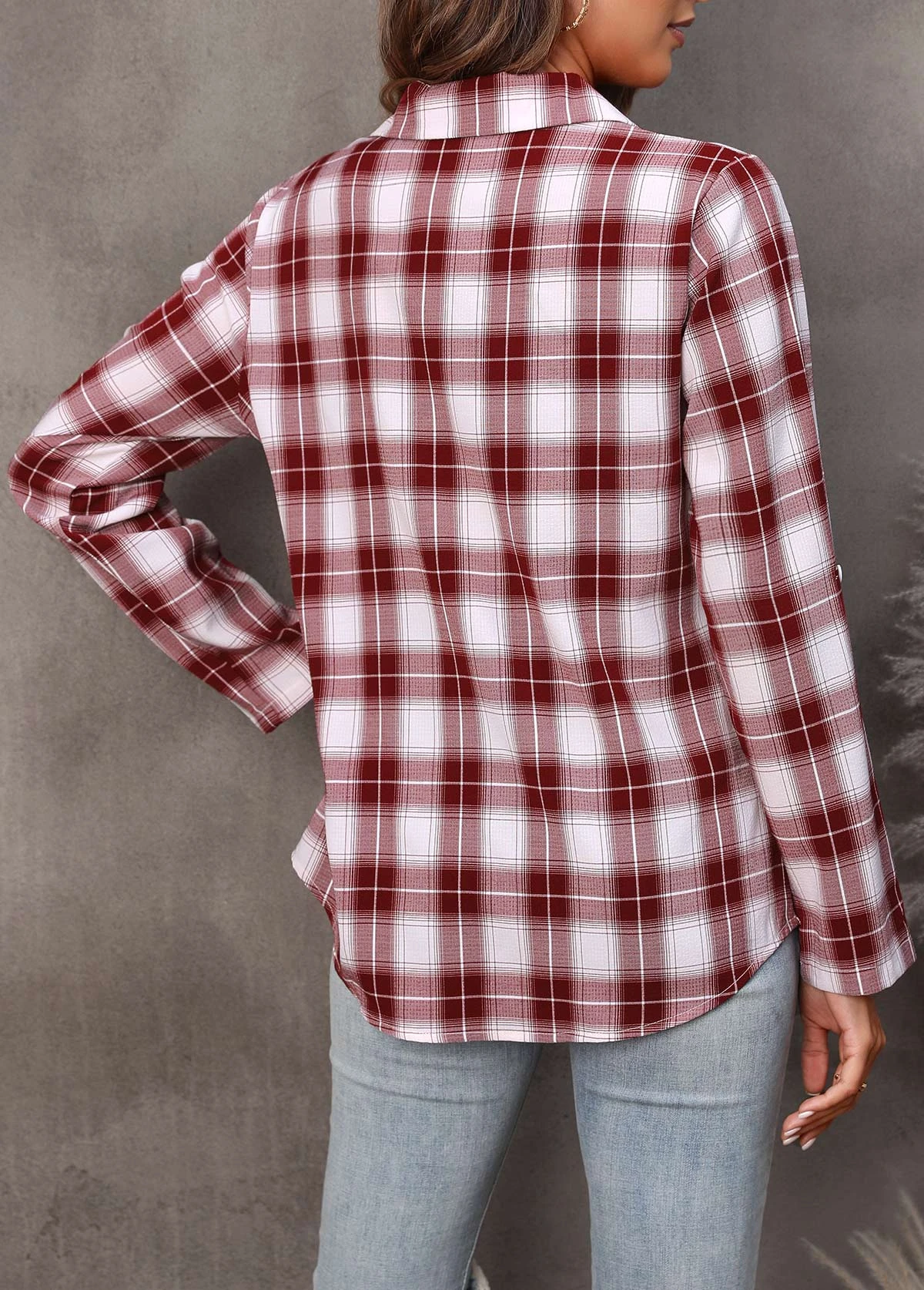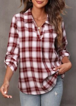 Wine Red Plaid Turndown Collar Blouse